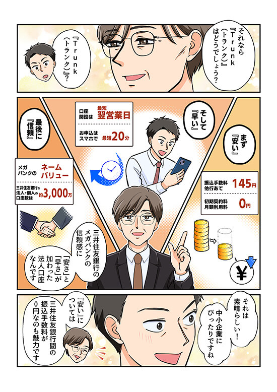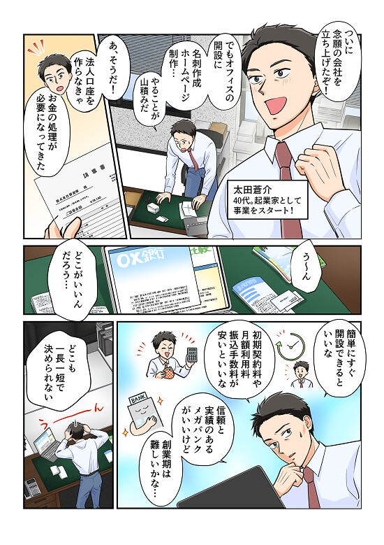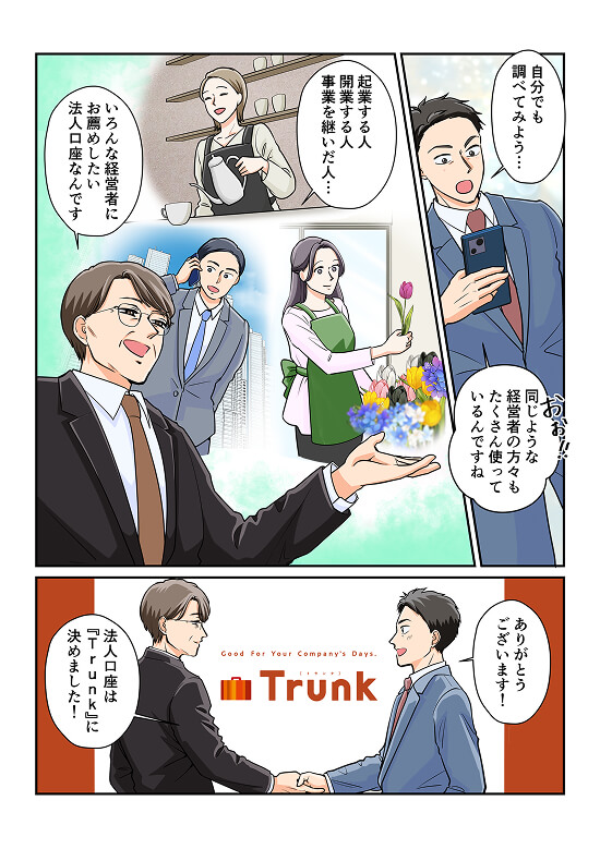 念願の会社を立ち上げた太田。法人口座選びに頭を悩ませていたところ、経営者相川さんとの出会いで「Trunk」の存在を知ることに…