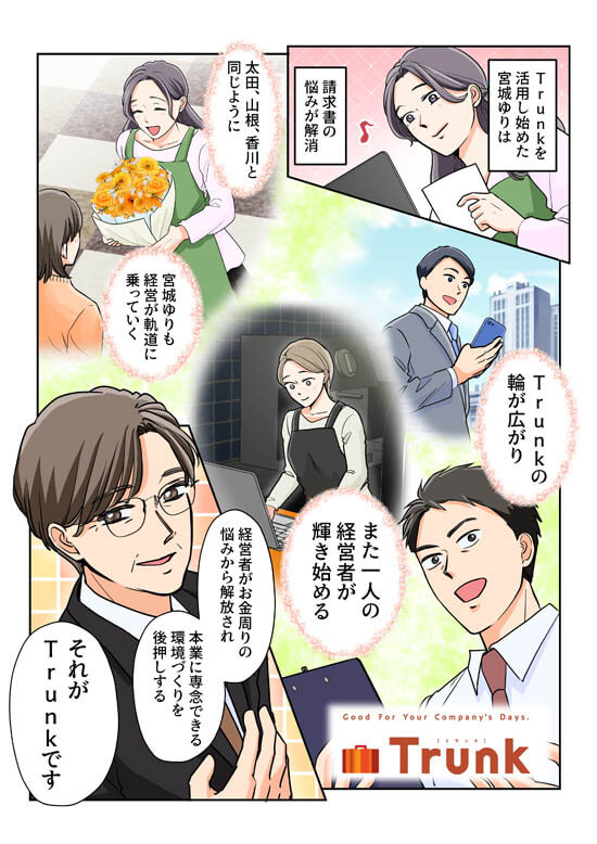 夢だった花屋を開業した宮城。請求書対応に追われ、資金繰りに悩む日々。そんな時、「Trunk」の請求書支払機能と出会い…