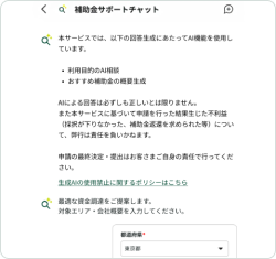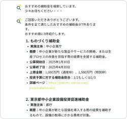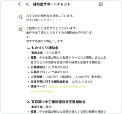 補助金サポートチャットで会話すると、入力内容を元にAIが最適な補助金を提案します。