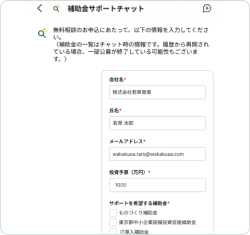 補助金サポート画面に遷移すると立ち上がるチャットに、必要事項を入力します。