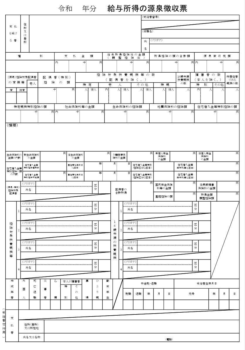 源泉徴収票とは、勤務先から1年間(1月1日〜12月31日)に支払われた給与や賞与、所得税などの情報がまとめられた書類です。
