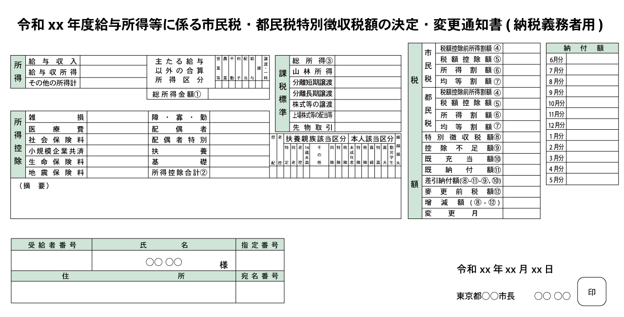会社員の場合は勤務先経由で配布され、個人事業主には自宅に郵送されます。住民税の納税額や課税根拠となる所得額を確認できます。