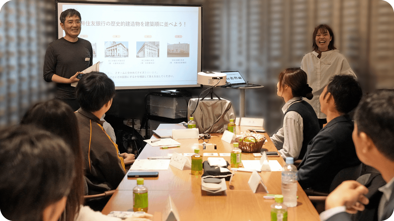 自己紹介のあとは、SMBCに関するクイズを2問。緊張をほぐすためにご用意したクイズコーナーですが、先の自己紹介で各チームすっかり打ち解けたご様子。思い思いに意見を交わしていただきました。