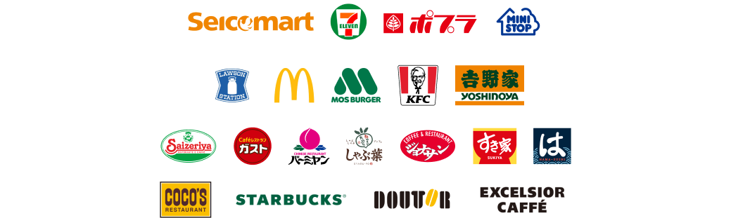 - セイコーマート※2、セブン‐イレブン、ポプラ※3、ミニストップ、ローソン※4、マクドナルド、モスバーガー※5、ケンタッキーフライドチキン、吉野家、サイゼリヤ、ガスト、バーミヤン、しゃぶ葉、ジョナサン、夢庵、その他すかいらーくグループ飲食店※6、すき家、はま寿司、ココス、スターバックス※7、ドトールコーヒーショップ、エクセルシオール カフェ、かっぱ寿司