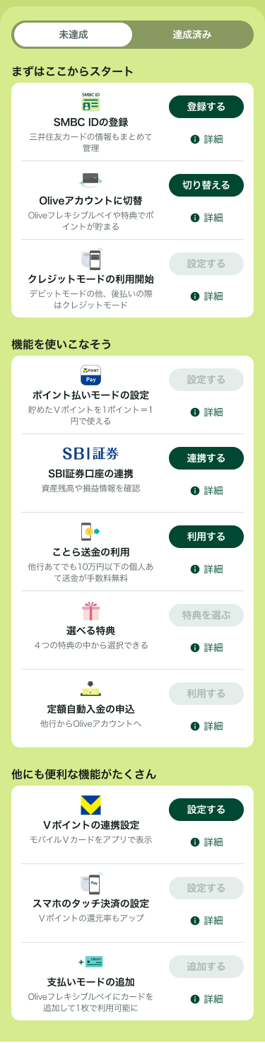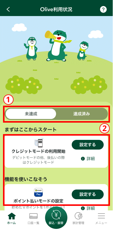 - 2未達成のサービスについて「設定する」等のボタンから登録・設定のお手続ができます。