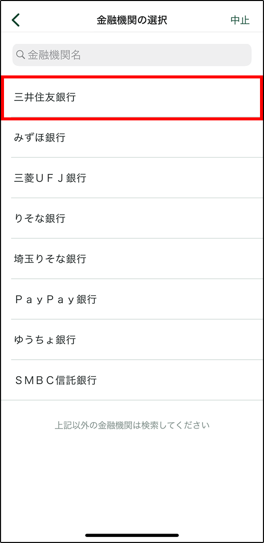 - ※選択肢にない金融機関の場合、漢字もしくはカナ名を入力し、検索して下さい。