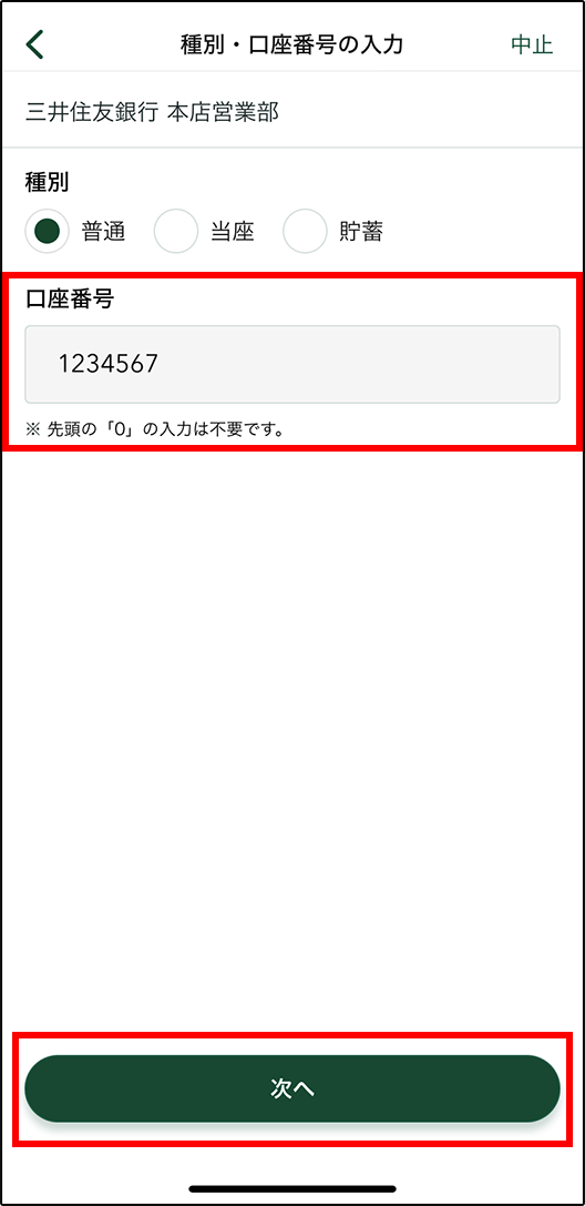 口座番号を入力し、「次へ」をタップします。