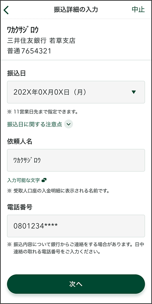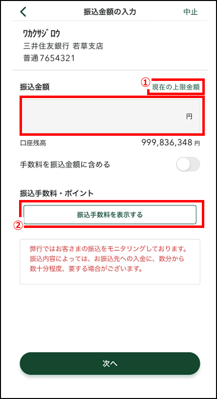 振込金額を入力し、「次へ」をタップします。