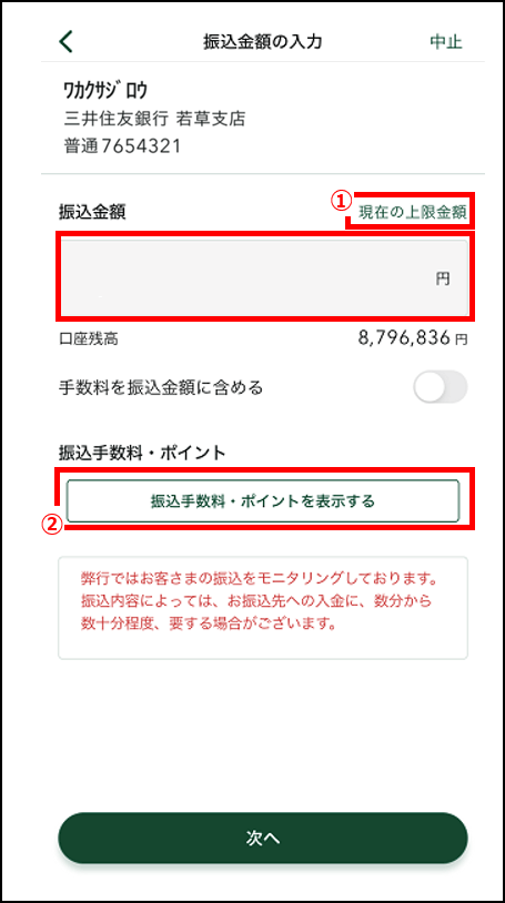 - ①「現在の上限金額」をタップすると1日あたりの振込上限金額を確認できます。