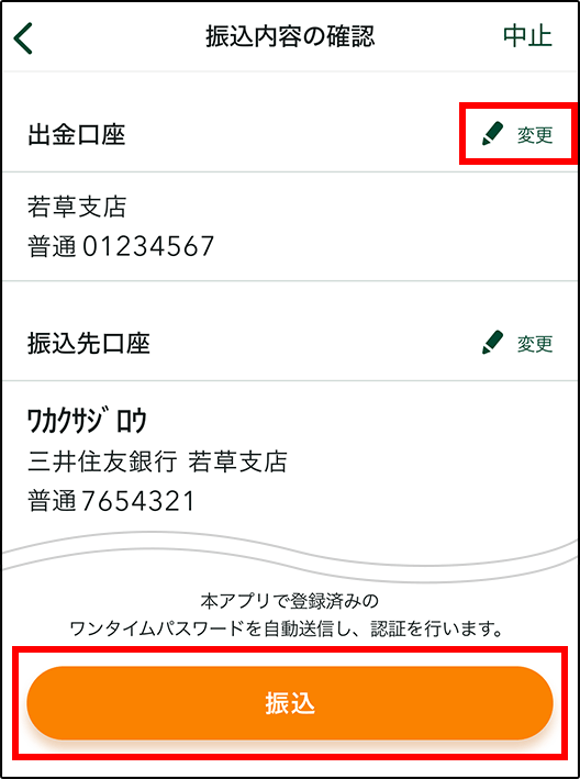 振込内容を確認し、間違いがあった場合は「変更」から訂正することができます。