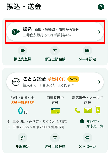 - ※日曜21時〜月曜7時は、「SMBCセーフティパス」を登録している場合、もしくは「ワンタイムパスワード」を有効化している場合のみ振込可能です。