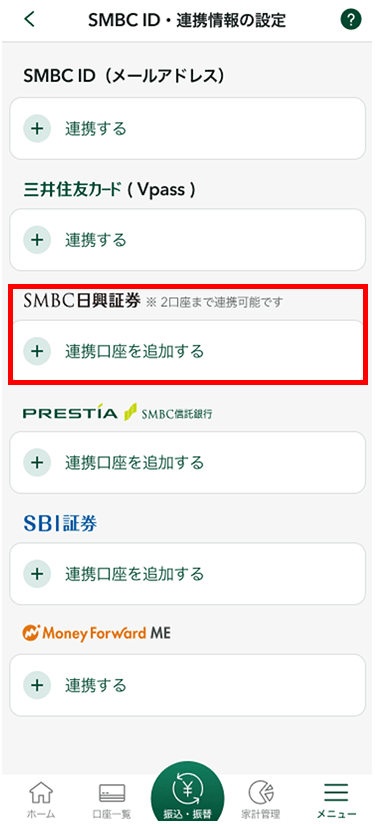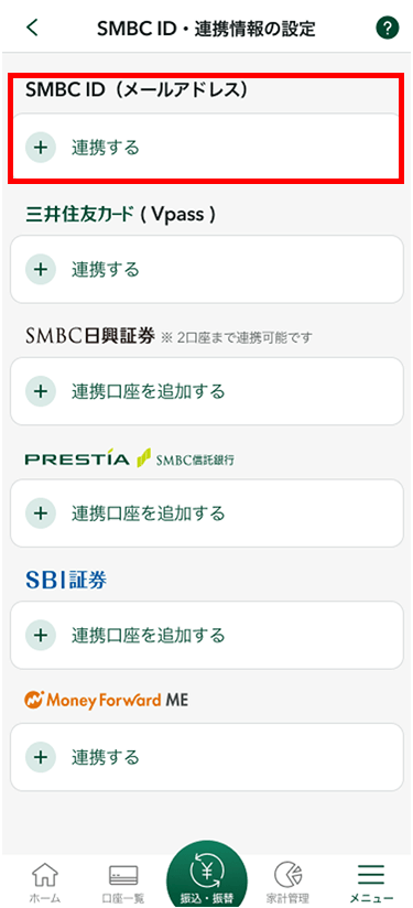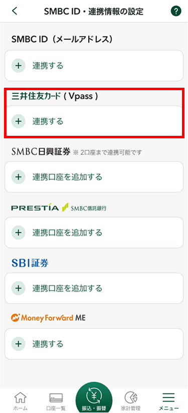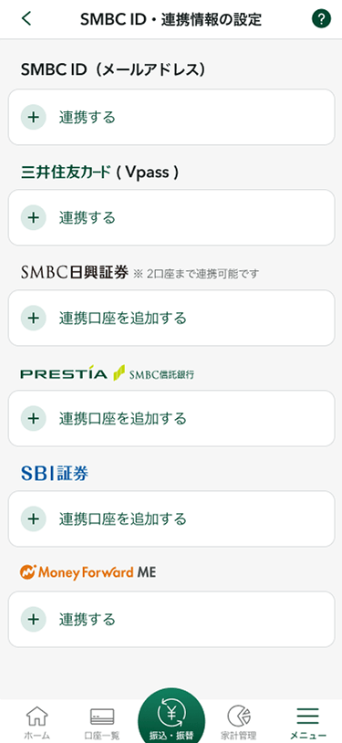 SMBC IDと三井住友カード(Vpass)を連携することができます。また、本アプリとSMBC日興証券口座、SBI証券口座、マネーフォワード MEと連携することができます。